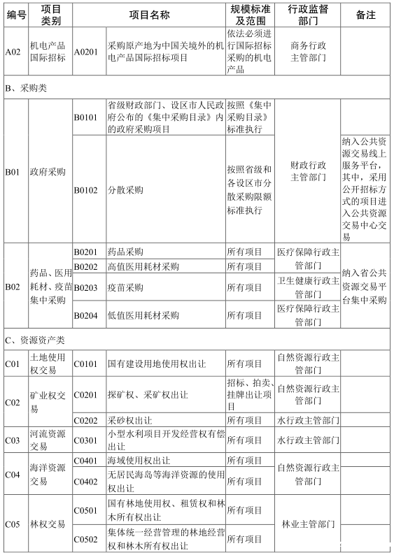 (四)加强公共资源交易目录管理。制定和发布《江苏省公共资源交易目录》(以下简称省交易目录),将适合以市场化方式配置的自然资源、资产股权、环境权的出让转让,依法必须招标的工程建设项目招标和机电产品国际招标,以及使用财政性资金以招标方式采购依法制定的政府集中采购目录以内或者采购限额标准以上的货物、工程和服务等各类公共资源交易纳入统一的公共资源交易平台。其他可以市场化配置的公共资源,按照“成熟一项、推动一项、进场一项”的原则,及时报省政府审核,补充列入省交易目录。省本级交易目录按照省交易目录执行;各设区市可以根据省交易目录,结合当地实际,制定和发布本地区交易目录。(省政务办牵头负责,公共资源交易各行业行政主管部门参与)