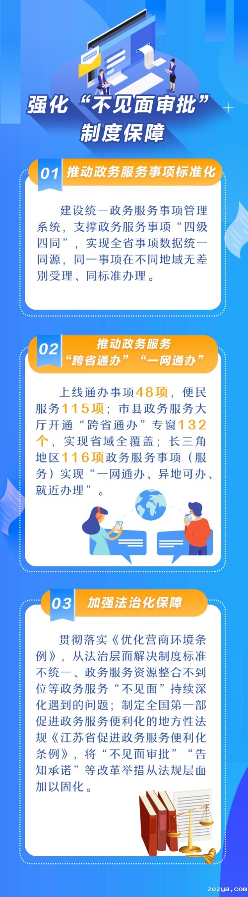 三是加强法治化保障。贯彻落实《优化营商环境条例》,从法治层面解决制度标准不统一、政务服务资源整合不到位等政务服务“不见面”持续深化遇到的问题。制定全国第一部促进政务服务便利化的地方性法规《江苏省促进政务服务便利化条例》,重点针对办证难、审批繁、监管任性等市场主体反映强烈的痛点、堵点,在地方事权范围内,整合审批流程、精简材料手续,将“不见面审批”“告知承诺”等改革举措从法规层面加以固化。