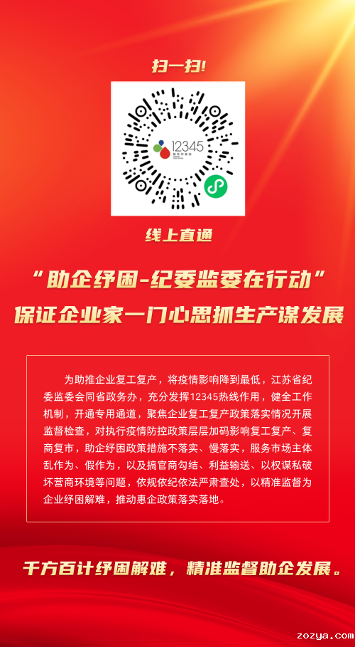 5月30日,省政务办印发通知,为积极配合纪委监委常态化开展企业复工复产监督检查,自5月31日起,江苏12345依托“一企来”服务运行机制,开通企业复工复产问题诉求专用通道。群众扫描“助企纾困·纪委监委在行动”二维码,就可以随时随地反映复工复产、复商复市等方面的诉求,纪委监委将及时跟进督查督办。