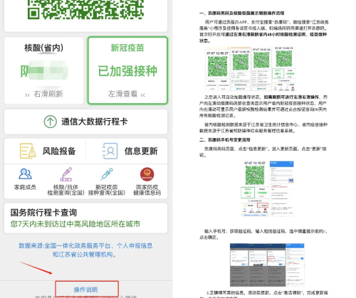 打开苏康码,新华日报·交汇点记者看到,首页上方滚动文字,提示用户健康申报时间调整为7天;页面底部新增“操作说明”,用户点击后可查看苏康码基本操作流程;打开“新冠疫苗接种查询(全国)”,能够看到省外接种记录,包括疫苗名称、接种省份、生产企业、接种日期。