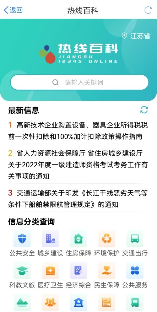为解决政策供求环节存在的“公开时用不着、需要时不好找”以及“政策资源分散、群众咨询多头问”等问题,江苏省政务办创新建设“热线百科”平台,省市县三级联动,为企业群众提供“一站式”“集成式”政策服务。平台上的信息与生产生活密切相关,划分为公共安全、城乡建设、住房保障、环境保护、交通出行、科教文旅、医疗卫生等15个类别。企业群众可通过江苏政务服务网、“苏服办”App、江苏12345微信公众号等渠道,“翻阅”这部“辞典”。除了点击类目查看,用户还可在搜索框中输入“关键词”,快速找到想要的答案。
