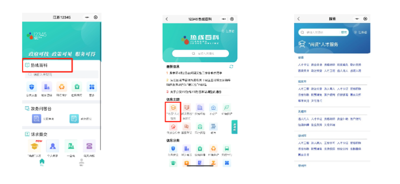 江苏12345在“热线百科”首页推出了“尚贤”人才服务主题,为人才提供政策信息搜索查询服务,方便人才快捷搜索、便利使用人才政策。目前已汇聚省、市、县三级761条人才政务信息,2939对热门人才政策问答,涵盖人才关心关注的人才工程、选人用人、资格职称、资金补助等17类主题,基本实现人才常见热门政策“一键可查、一屏通览”。人才如需查询政策,可登录江苏12345小程序,点击“热线百科”进入“尚贤”人才服务主题,也可通过苏服办APP、江苏政务服务网等渠道进入“热线百科”自助查询。为了提高人才政策知晓度,促进人才政策执行落实,“尚贤”将通过短信和电话,向高层次人才、专技类人才等群体,主动推送党委政府出台的人才政策信息,实现从“人才找政策”向“政策找人才”转变。