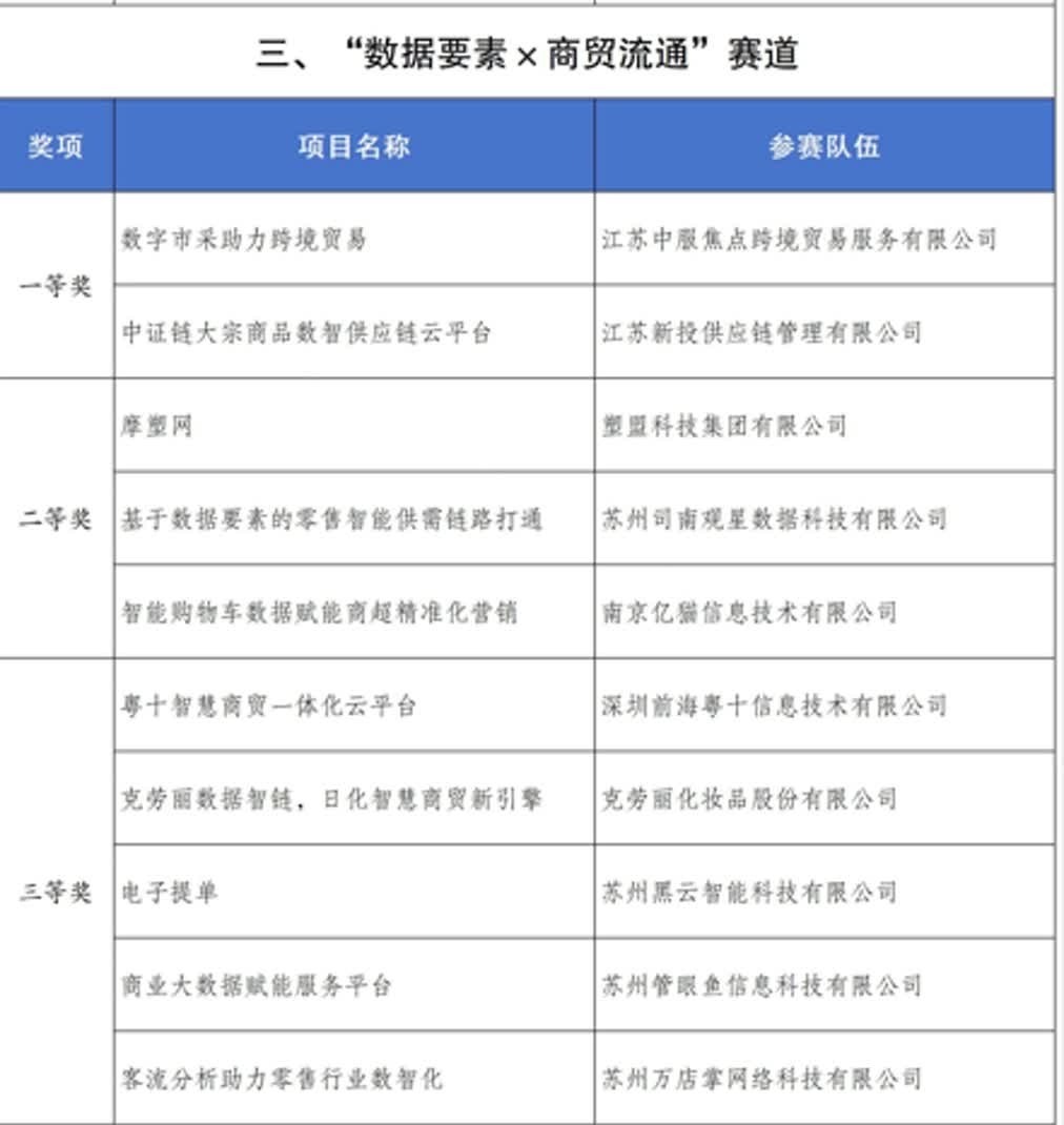其中,一等奖获得者为江苏中服焦点跨境贸易服务有限公司申报的《数字市采助力跨境贸易》以及江苏新投供应链管理有限公司申报的《中证链大宗商品数智供应链云平台》。