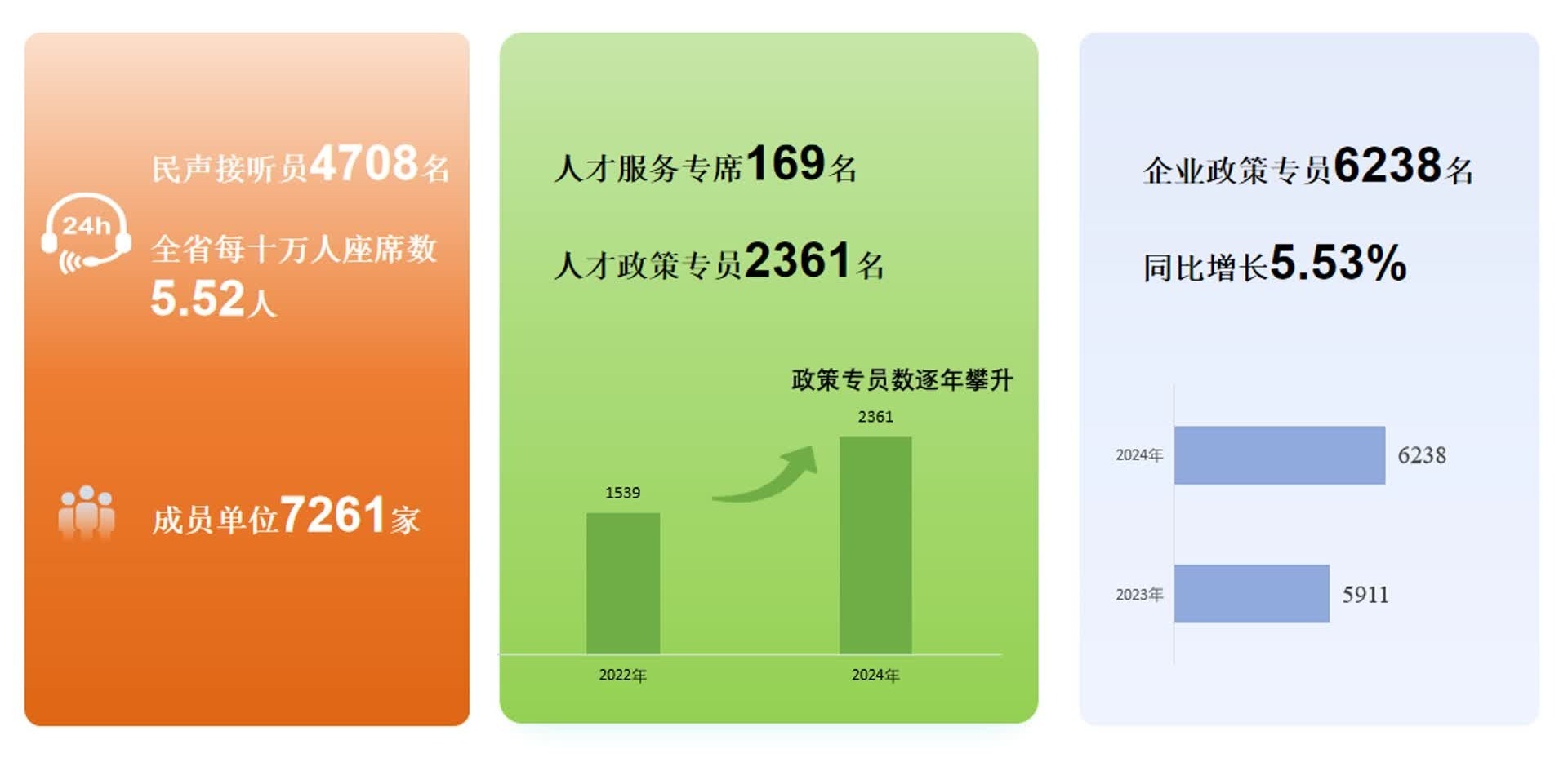 为了保障每一个群众和企业诉求都能“接得更快、分得更准、办得更实、连得更紧、用得更好、运行更安全”,12345热线持续充实服务力量,提升服务水平。截至2024年底,全省民声接听员共有4708名,全省每十万人座席数5.52人、企业服务政策专员6238名,人才政策专员2361名。全省12345热线成员单位增加到7261家,群众和企业诉求的响应能力、服务能力明显提升。