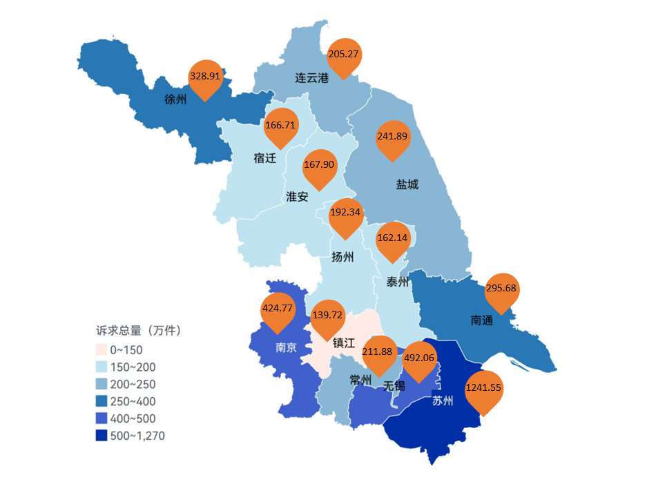 从全省诉求分布情况来看,苏州、无锡、南京的诉求量占比较多。