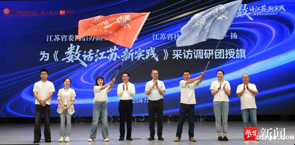 江苏省委网信办副主任尤健,江苏省社会科学院党委委员、副院长,区域现代化研究院院长李扬为采访调研团授旗