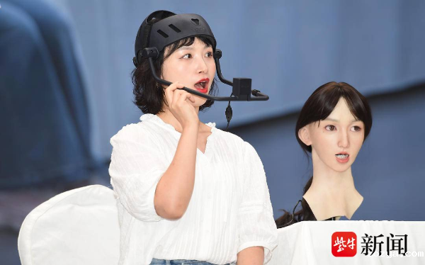 现场最令人惊叹的是皮肤型人形机器人,这款机器人具有高仿真皮肤,当日在现场展示的仿真皮肤头部模型,还有定制形象悟空、小诗,它们的面部都可以精准模拟人类面部的微表情。当记者现场演示时,套上遥操作系统,就能够实时采集人类面部表情,捕捉精细的表情和动作数据,让仿真皮肤头部模型做出一模一样的表情甚至模仿搞怪“表情包”,这就是令很多人叹为观止的动捕技术。