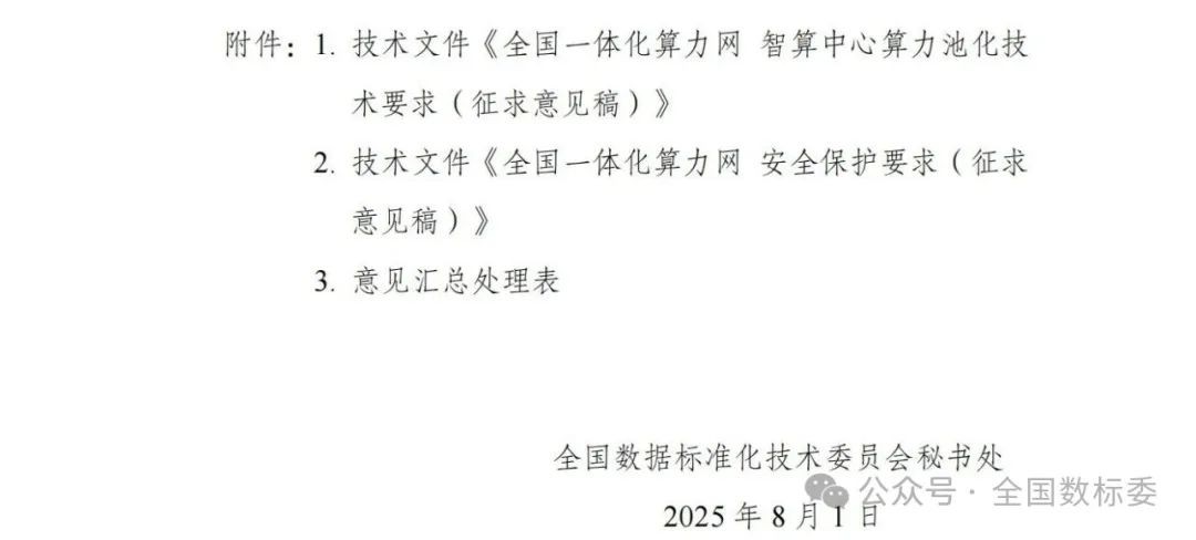 贯彻落实《关于深入实施“东数西算”工程 加快构建全国一体化算力网的实施意见》《国家数据基础设施建设指引》等政策文件要求,充分发挥标准在加快算力池化先进技术部署应用及统筹算力发展与安全保障等方面的规范和引导作用,在国家数据局指导下,根据《全国一体化算力网 监测调度平台建设指南》体系框架中关于算力资源和算力安全部分规划,全国数据标准化技术委员会(以下简称“全国数标委”)秘书处牵头研制了《全国一体化算力网 智算中心算力池化技术要求》《全国一体化算力网 安全保护要求》等2项技术文件(见附件1和2),经研究讨论、修改完善,形成技术文件征求意见稿。